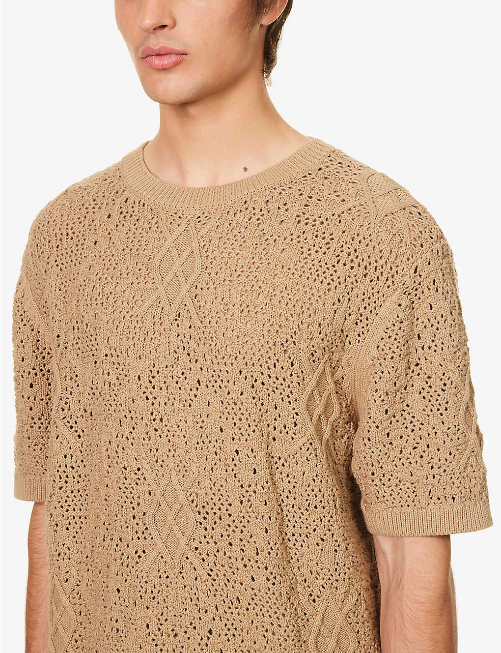 - Regular fit, crewneck, dropped shoulders, short sleeves, crochet knit, all-over knitted branding, ribbed trims