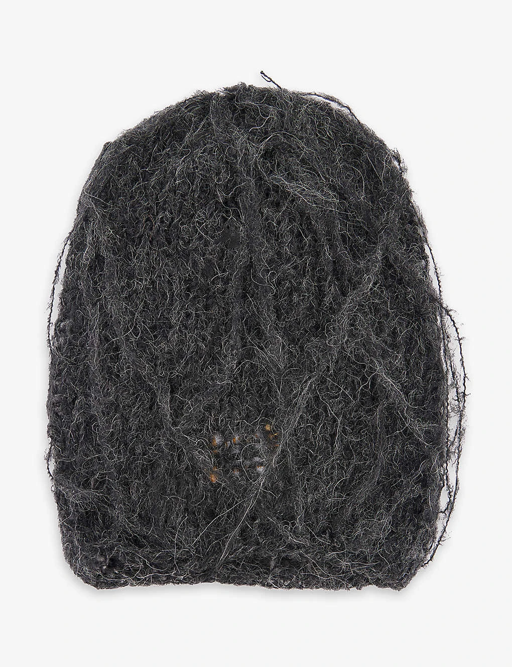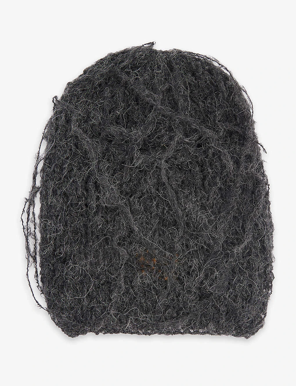 - Loose threads, hand-distressed finish, obscured eye slot