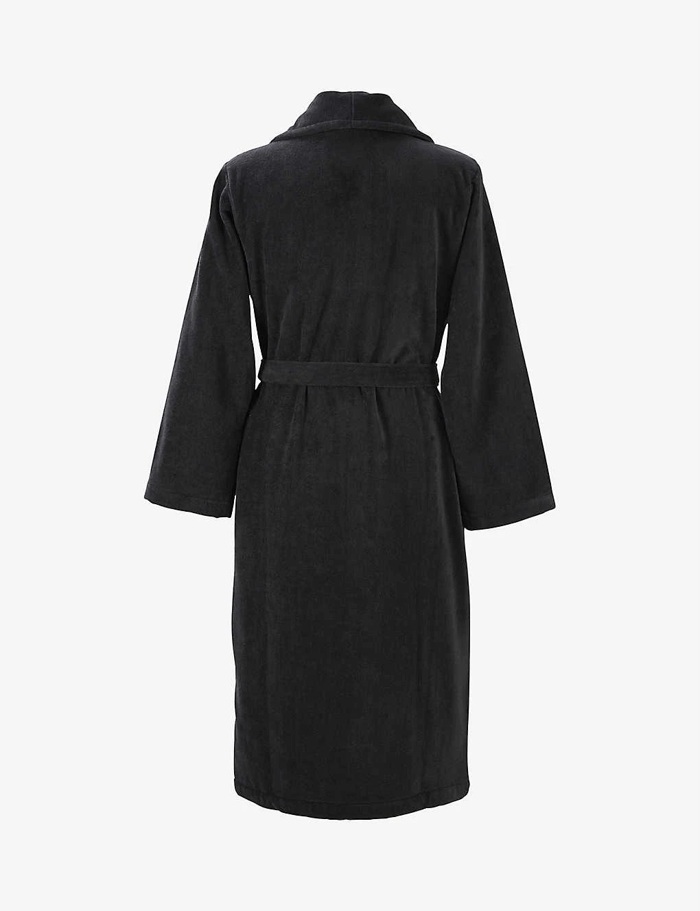 - Shawl collar, long sleeves, logo embroidered onto the chest, all-over terry velour texture, belt loops, self-tie fastening, patch pocket on the chest, two patch pockets at the hips, 400gr/m²