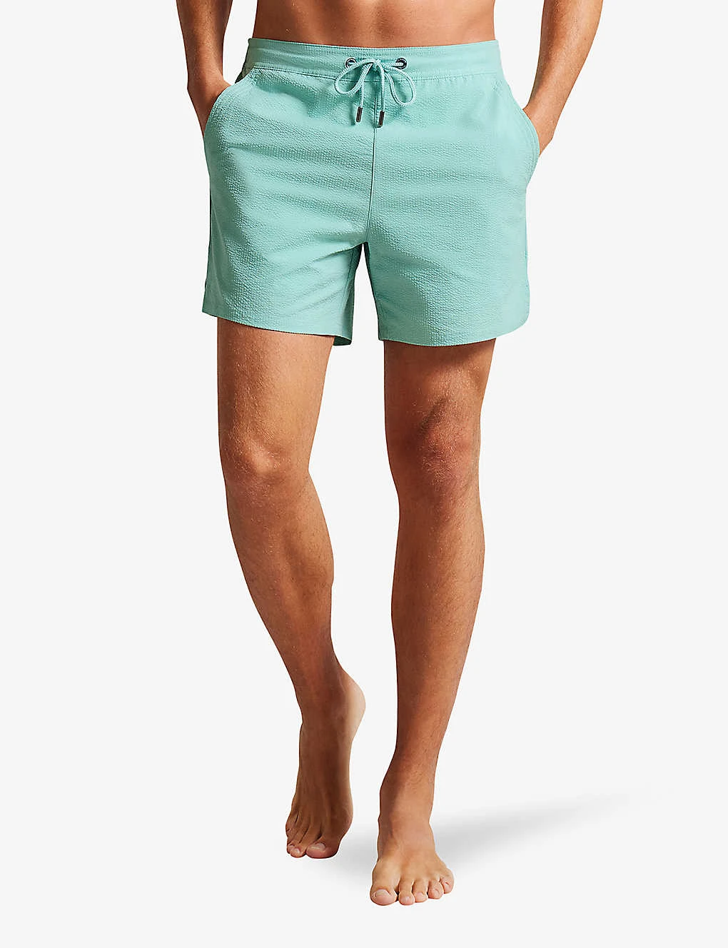 - Relaxed fit, mid rise, drawstring elasticated waistband, side pockets, all-over seersucker texture, welt pocket and brand tab at back